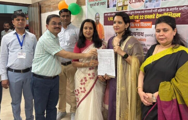 मुजफ्फरनगर। उत्तर प्रदेश अधीनस्थ सेवा चयन आयोग द्वारा निष्पक्ष और पारदर्शी भर्ती प्रक्रिया के अंतर्गत पूरे प्रदेश में कुल 1112 कनिष्ठ सहायकों तथा 12 एक्स-रे टेक्नीशियनों को मुख्यमंत्री योगी आदित्यनाथ द्वारा लखनऊ में आयोजित कार्यक्रम के दौरान नियुक्ति पत्र प्रदान किए गए हैं। इसी कड़ी में सोमवार को जनपद मुज़फ्फरनगर में यहां से चयनित 15 कनिष्ठ सहायकों को नियुक्ति पत्र वितरित किए गए। एमएलसी वंदना वर्मा, जिला पंचायत अध्यक्ष डॉ. वीरपाल निर्वाल, नगरपालिका चेयरमैन मीनाक्षी स्वरूप, जिला अध्यक्ष भारतीय जनता पार्टी सुधीर सैनी, जिलाधिकारी उमेश मिश्रा, मुख्य विकास अधिकारी कंडारकर कमल किशोर देशभूषण द्वारा 15 कनिष्ठ सहायकों को नियुक्ति पत्र प्रदान किए गए।