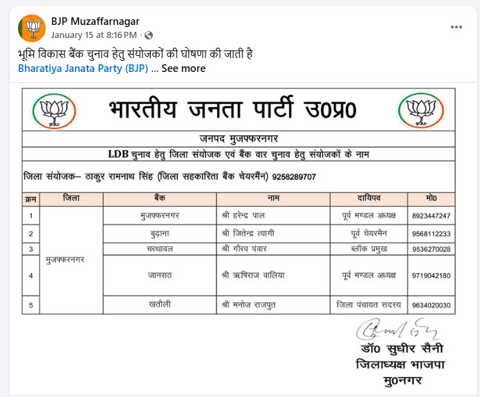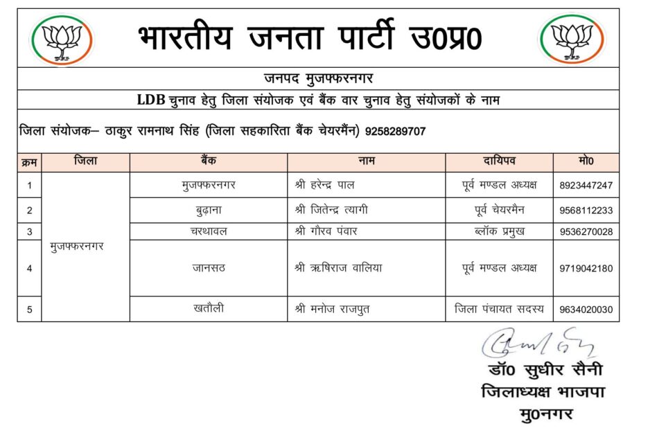 दरअसल, जनपद मुजफ्फरनगर में भूमि विकास बैंक लि. के डेलीगेट्स के साथ ही चेयरमैन का चुनाव होना प्रस्तावित है। इसके लिए भारतीय जनता पार्टी के जिलाध्यक्ष डॉ. सुधीर सैनी के द्वारा 15 जनवरी को जिला संयोजक और संयोजकों की सूची जारी की गई थी। इसमें पदाधिकारियों के मोबाइल फोन नम्बर भी जारी किये गये थे। भाजपा की ओर से इस चुनाव के लिए जिला सहकारी बैंक के चेयरमैन ठा. रामनाथ सिंह को जिला संयोजक बनाया गया और पूर्व मंडल अध्यक्ष हरेन्द्र पाल को मुजफ्फरनगर, पूर्व चेयरमैन जितेन्द्र त्यागी को बुढ़ाना, गौरव पंवार को चरथावल, ऋषिराज वालिया को जानसठ और मनोज राजपूत को खतौली भूमि विकास बैंक प्रतिनिधि चुनाव के लिए संयोजक का दायित्व दिया गया था।