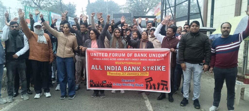 मुजफ्फरनगर। मुजफ्फरनगर में मंगलवार को बैंक कर्मचारियों और अधिकारियों का आक्रोश खुलकर सामने आया। लंबे समय से लंबित मांगों, विशेष रूप से सप्ताह में पांच दिन बैंकिंग व्यवस्था लागू करने को लेकर केंद्र सरकार की चुप्पी के विरोध में यूनाइटेड फोरम ऑफ बैंक यूनियंस (यूएफबीयू) के बैनर तले विशाल प्रदर्शन और एकदिवसीय हड़ताल का आयोजन किया गया।