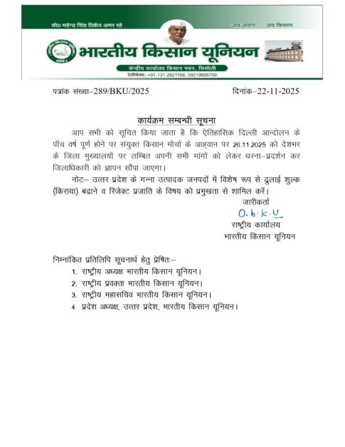 भाकियू शीर्ष नेतृत्व द्वारा शनिवार को जारी की गई आंदोलन की सूचना के अनुसार इस वर्ष ऐतिहासिक दिल्ली किसान आंदोलन के पाँच वर्ष पूर्ण हो रहे हैं। इसी अवसर पर संयुक्त किसान मोर्चा के आह्वान पर 26 नवम्बर 2025 को देशभर के किसान अपनेदृअपने जिला मुख्यालयों पर एकजुट होकर धरनादृप्रदर्शन करेंगे और जिलाधिकारियों को ज्ञापन सौंपेंगे। संगठन ने विशेष तौर पर उत्तर प्रदेश के गन्ना उत्पादक जनपदों की समस्याओं को रेखांकित किया है। जारी सूचना में कहा गया कि ढुलाई शुल्क (किराया) बढ़ाए जाने और रिजेक्ट प्रजाति को लेकर किसानों में भारी नाराजगी है। भाकियू इन दोनों मुद्दों को प्रमुखता से उठाते हुए किराया बढ़ोतरी का विरोध करेगी।