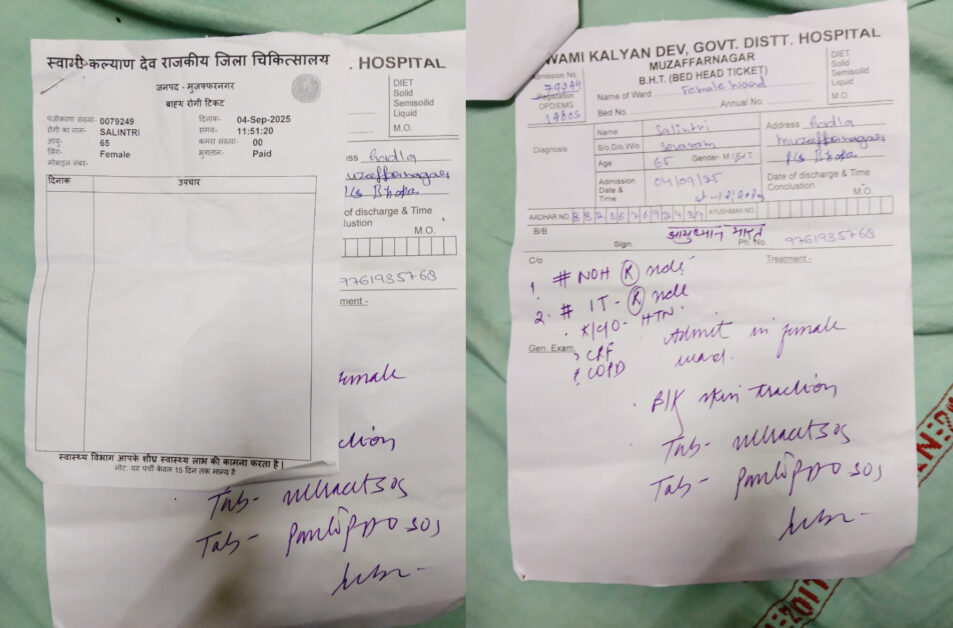 भोपा क्षेत्र के गांव गादला निवासी नीरज त्यागी कई समाचार पत्रों में फोटो जर्नलिस्ट के तौर पर काम करते रहे। पिछले दिनों बीमारी के कारण नीरज त्यागी का निधन हो गया। उनकी बुजुर्ग माता, पत्नी और बच्चे गांव में ही गुजर बसर कर रहे हैं। पिछले दिनों नीरज त्यागी की 65 वर्षीय माता सालित्री देवी पत्नी सेवाराम घर पर ही अचानक गिर गई। परिजनों ने उनको चिकित्सक को दिखाया तो पता चला कि उनके कूल्हे की हड्डी टूट गई है। प्राइवेट में उपचार कराया तो ऑपरेशन का परामर्श दिया गया। परिजनों ने समाजसेवी मनीष चौधरी से सम्पर्क किया। उन्होंने सालित्री देवी को 4 सितम्बर को जिला चिकित्सालय में लाकर चिकित्सक को दिखाया। अस्थि रोग विभाग के चिकित्सक डॉ. चतुर्वेदी ने उनका परीक्षण किया और ऑपरेशन की सलाह देते हुए भर्ती कर लिया तथा जांच कराई। मनीष चौधरी के अनुसार इसी बीच डॉ. चतुर्वेदी ने परिजनों को कहा कि उपचार सम्बंधी परामर्श के लिए अस्थि रोग विभाग के कर्मचारी लोकेश कुमार से सम्पर्क कर लें। वो सारी चीजों को समझा देगा।