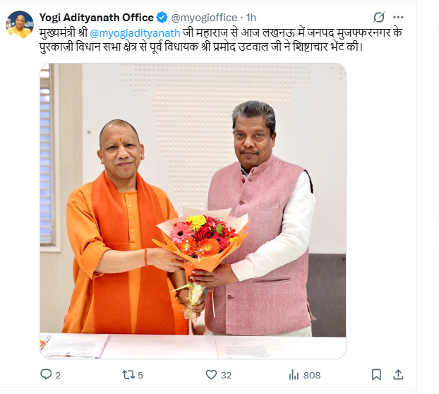मुख्यमंत्री श्री @myogiadityanath जी महाराज से आज लखनऊ में जनपद मुजफ्फरनगर के पुरकाजी विधान सभा क्षेत्र से पूर्व विधायक श्री प्रमोद उटवाल जी ने शिष्टाचार भेंट की। pic.twitter.com/QytZac4cQU