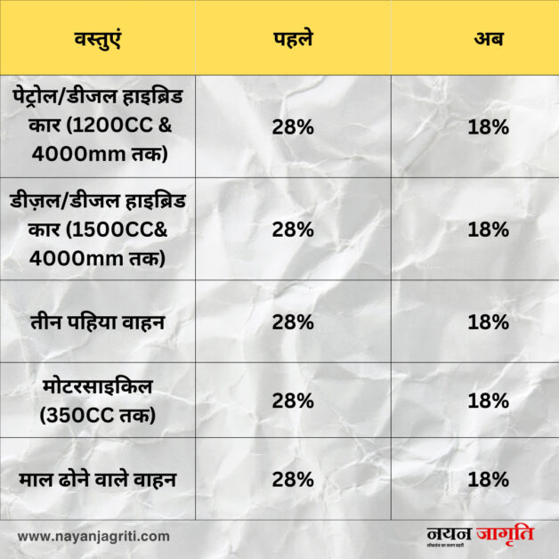 छोटे वाहन (पेट्रोल, सीएनजी, एलपीजी इंजन 1,200cc तक व 4,000mm लंबाई तक और डीजल वाहन 1,500cc तक) अब 18% स्लैब में आएंगे।