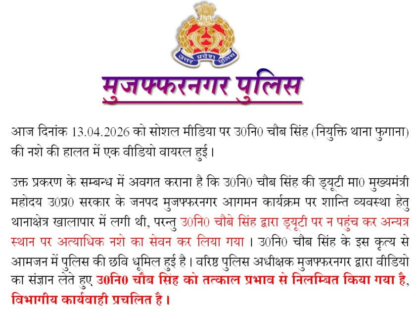 उल्लेखनीय है कि मुजफ्फरनगर में 13 अप्रैल को रोजगार मेला के शुभारंभ के लिए मुख्यमंत्री योगी आदित्यनाथ और अन्य वीआईपी उस समय प्रशासनिक हलचल तेज हो गई जब थाना फुगाना में तैनात उपनिरीक्षक चौबे सिंह का एक वीडियो सोशल मीडिया पर वायरल हुआ। वीडियो में वह कथित तौर पर नशे की हालत में दिखाई दे रहे थे। यह घटना मुख्यमंत्री योगी आदित्यनाथ के जनपद आगमन कार्यक्रम के दौरान सामने आई, जिससे पुलिस विभाग की कार्यप्रणाली पर भी सवाल उठने लगे।