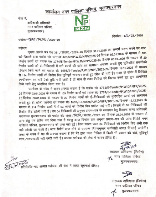 नगरपालिका परिषद् में शहर के विभिन्न क्षेत्रों में प्रस्तावित 218 निर्माण कार्यों,कृजिनमें अधिकांश कार्य सड़क और नाला निर्माण से संबंधित हैंकृकी निविदाओं में ठेकेदारों द्वारा कथित रूप से फर्जी प्रपत्र लगाए जाने के आरोपों को लेकर विवाद गहराता जा रहा है। भाजपा सभासदों योगेश मित्तल, राजीव शर्मा, मनोज वर्मा, सीमा जैन, रजत धीमान और देवेश कौशिक ने अधिशासी अधिकारी डॉ. प्रज्ञा सिंह को पत्र लिखकर इन निर्माण कार्यों के लिए 12 जनवरी और 27 जनवरी को प्राप्त निविदाओं में गंभीर अनियमितताओं का आरोप लगाया था।