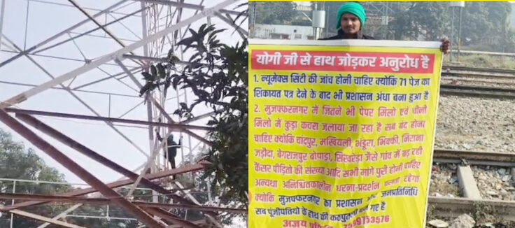 मुजफ्फरनगर। मुजफ्फरनगर में न्यू मैक्स सिटी टाउनशिप परियोजना को लेकर उठ रहे सवाल अब सड़क से निकलकर आसमान तक पहुंच गए हैं। पहले समाजसेवी विकास बालियान द्वारा मामले को उजागर किए जाने के बाद अब एक युवा सामाजिक कार्यकर्ता ने रेलवे स्टेशन स्थित टावर पर चढ़कर धरना प्रदर्शन शुरू कर दिया है। यह प्रदर्शन जिले में बढ़ते प्रदूषण और न्यू मैक्स सिटी भूमि प्रकरण की निष्पक्ष जांच की मांग को लेकर किया जा रहा है, जिसने प्रशासन की चिंता बढ़ा दी है।