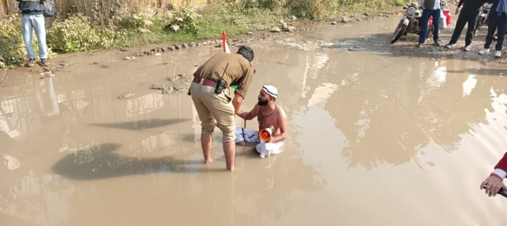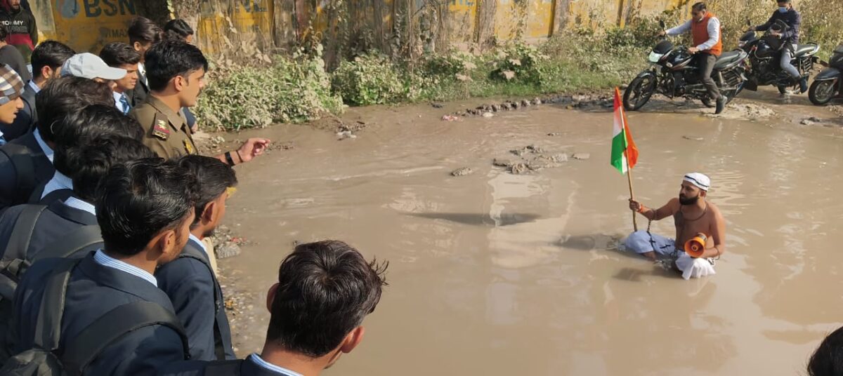 मुजफ्फरनगर। सुबह विजय हिंदुस्तानी, एक युवा राष्ट्रवादी कार्यकर्ता, ने विजय हिंदुस्तानी परिक्रमा मार्ग पर जल समाधि लेकर सड़क की बदहाली के खिलाफ विरोध जताया। उन्होंने यह कदम तब उठाया जब इस मार्ग की मुख्य सड़क पर लगातार जलभराव और खतरनाक गड्ढों के कारण लोग दुर्घटनाओं का शिकार हो रहे थे। इसके बाद, छात्रों और स्थानीय लोगों ने उनके समर्थन में एक बड़ा जमावड़ा किया और सड़क की स्थितियों के खिलाफ आवाज उठाई।
